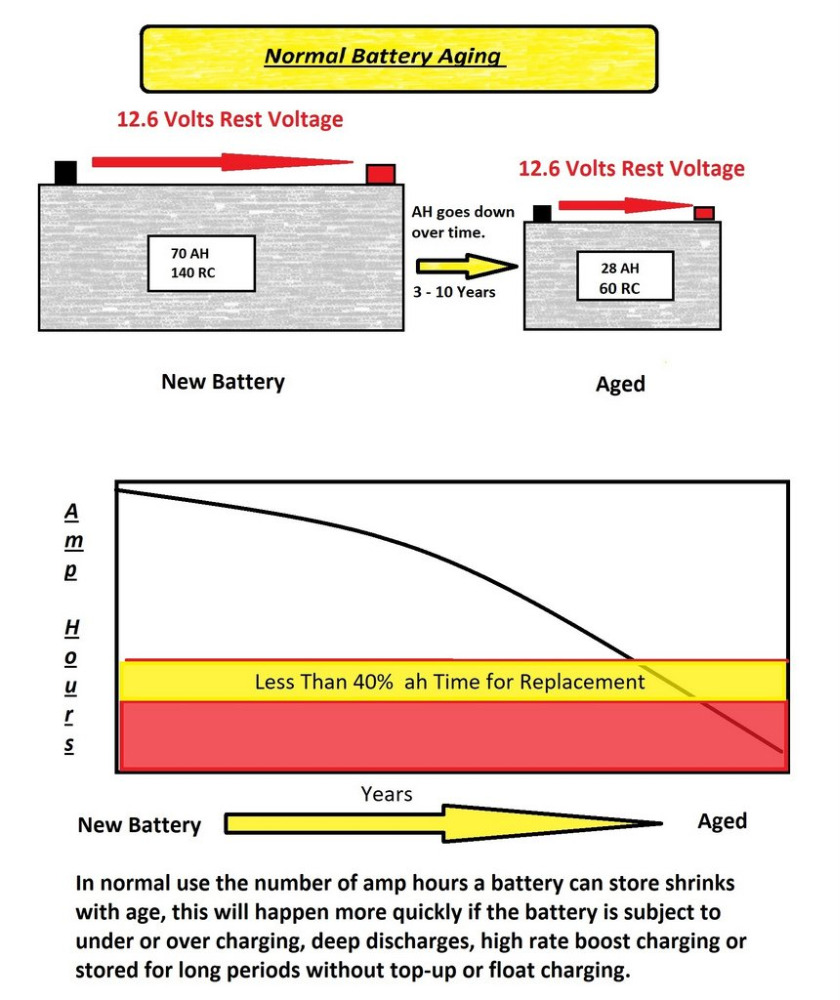 С годами эксплуатации, даже при условии соблюдения правил эксплуатации и правильного обращения, количество ампер-часов, которое может хранить аккумулятор, уменьшается, хотя напряжение покоя разомкнутой цепи может оставаться неизменным. В обычных автомобильных аккумуляторах падение ёмкости до 40% от первоначальной ёмкости считается порогом замены. Фактически, наш пример аккумулятора ёмкостью 70 А·ч сокращается до 28 А·ч. Даже при ёмкости всего 20–30% аккумулятор может продолжать запускать автомобиль при нормальном использовании, но у него не будет резервной ёмкости, если, например, фары будут включены даже на короткое время. При обслуживании автомобилей экстренных служб и других критически важных приложений следует выбирать в качестве порога более высокий процент от первоначальной ёмкости.