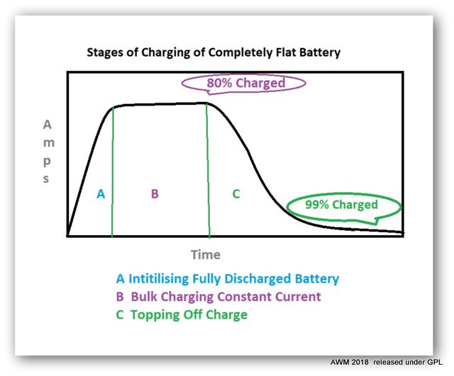 Когда аккумулятор новый или полностью разряжен, катодная (-) и анодная (+) пластины не готовы принимать заряд. Зарядный ток будет оставаться на уровне или близким к нулю, пока через некоторое время аккумулятор не начнет принимать заряд, и ток заряда не начнет увеличиваться. Обычно подавляющее большинство аккумуляторов, с которыми вы столкнетесь, имеют некоторый остаточный заряд и сразу переходят к следующему этапу — зарядке постоянным током или зарядке нарастающим током.
