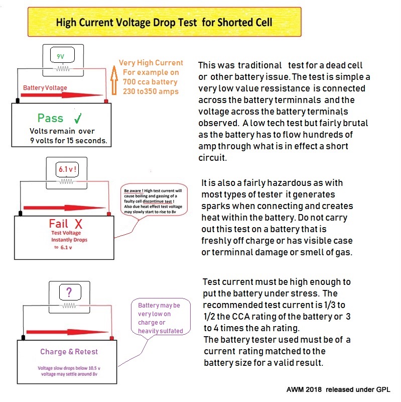 Если аккумулятор необходимо проверить немедленно, чтобы получить точную картину его состояния и заряда, поверхностный заряд можно снять, включив фары примерно на 3 минуты перед проверкой. Если напряжение аккумулятора падает довольно быстро после включения фар, это верный признак неисправности аккумулятора, обычно в результате короткого замыкания в ячейке, также, иногда, такая ячейка называется «газовыделящей», «вскипающей» или «мертвой» ячейкой.