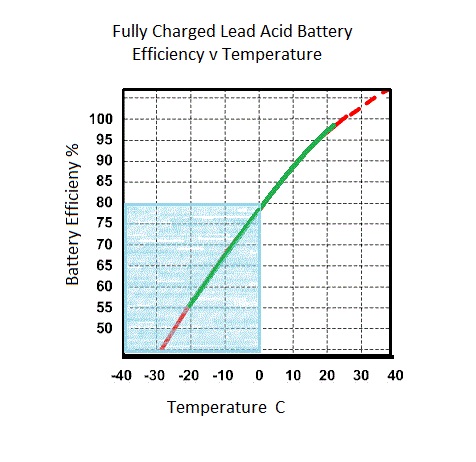 Характеристики аккумулятора при запуске двигателя во многом зависят от температуры: при температуре замерзания (0°C или 32°F) новый полностью заряженный аккумулятор будет иметь лишь 80% своей мощности при комнатной температуре. В очень холодную зиму (-20°C или -4°F) мощность падает до 55%. Если аккумулятор заряжен лишь частично, в полуарктических условиях электролит может замерзнуть. Не пытайтесь заряжать или запускать замерзший аккумулятор, предварительно не разморозив его.
