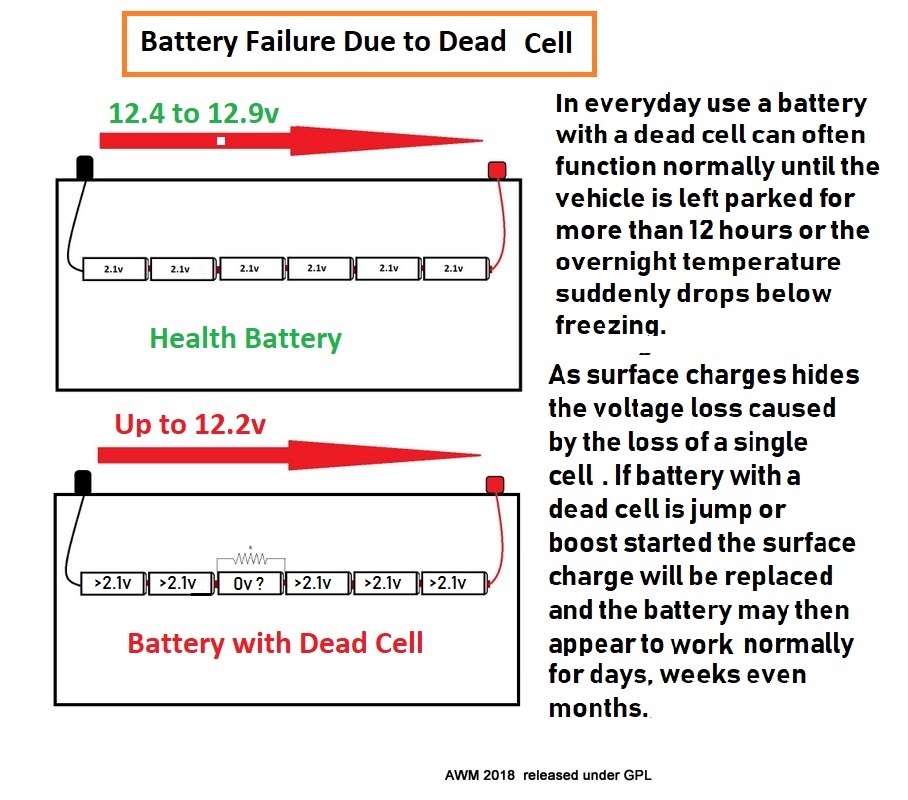АКБ с мертвой ячейкой иногда может функционировать нормально пока авто не будет припарковано на более чем 12 часов или же, ночная температура внезапно не снизится ниже точки замерзания.