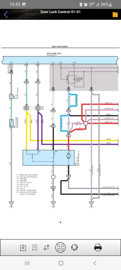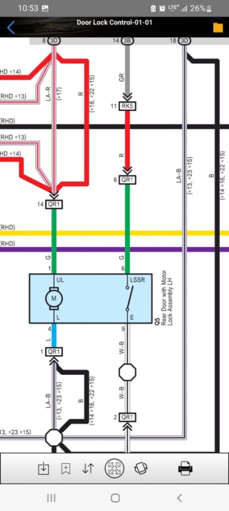 Не рабочий центральный замок задней левой двери. Сначала, вместо снятия обшивки, проверил приходит ли сигналы в проводах G и L между дверю и кузовом (см. Q5 и QR1 на схеме Door Lock Control ). Сигналы приходили. Массу не стал проверять так, как было ясно что масса есть по причине того, что работали остальные замки получающие общую массу с реле центрального замка. (см. схема).